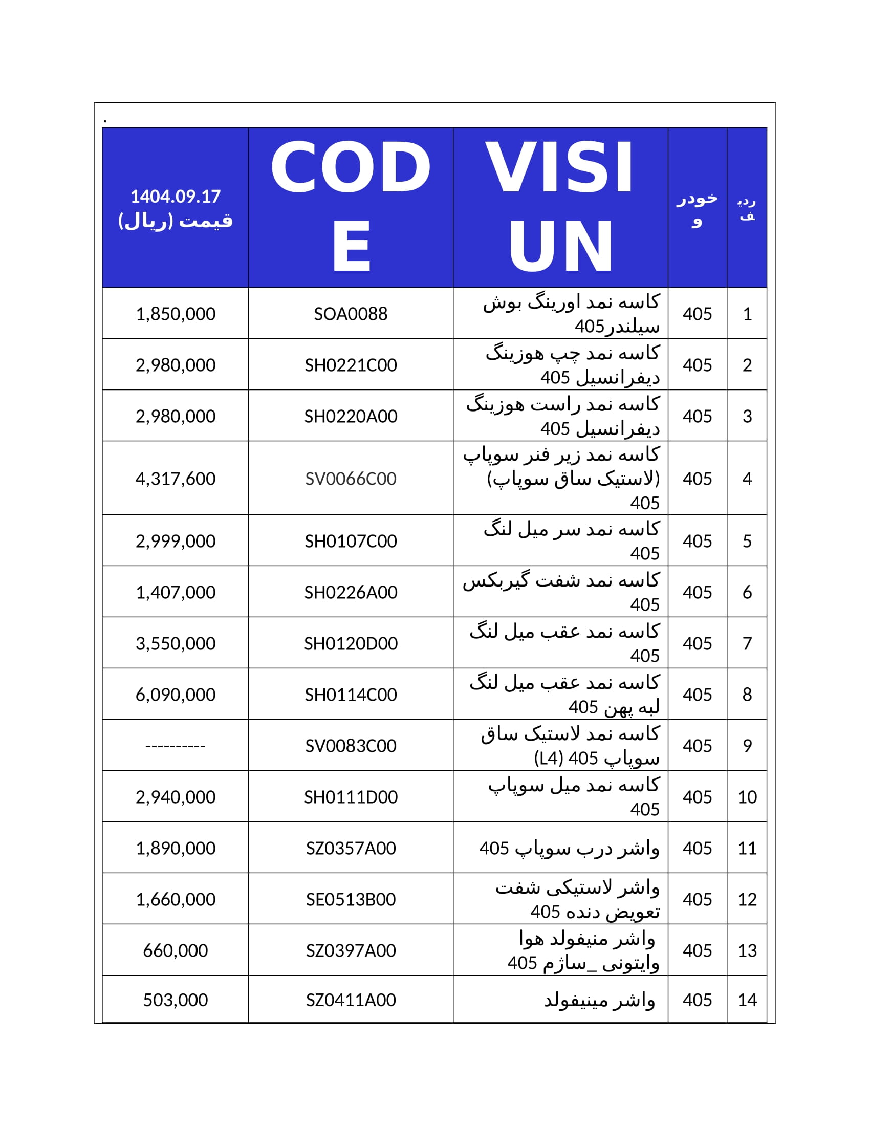 لیست ویژن تاریخ 1404/07/18منتشر شده در 1404/09/17لیست قیمت ویژن در بازار در تاریخ 1404/07/18ویژنلیستکاسه نمد